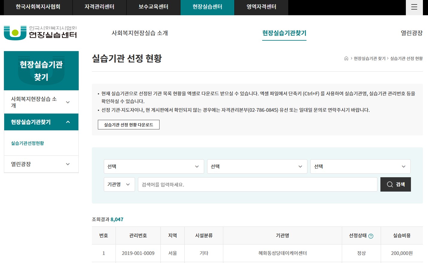 현장실습센터- 현장실습기관 찾기 메뉴를 클릭하시면, 전국의 사회복지사 현장 실습 기관 선정 현황을 확인하실 수 있으며, 실습 비용 및 실습기관 선정 유효기관까지 확인하실 수 있습니다.