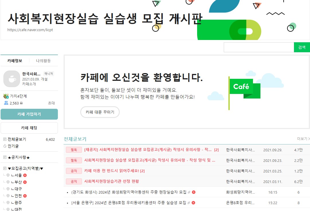 2. 한국 사회복지사 협회이 실습생 모집 게시판 확인하기